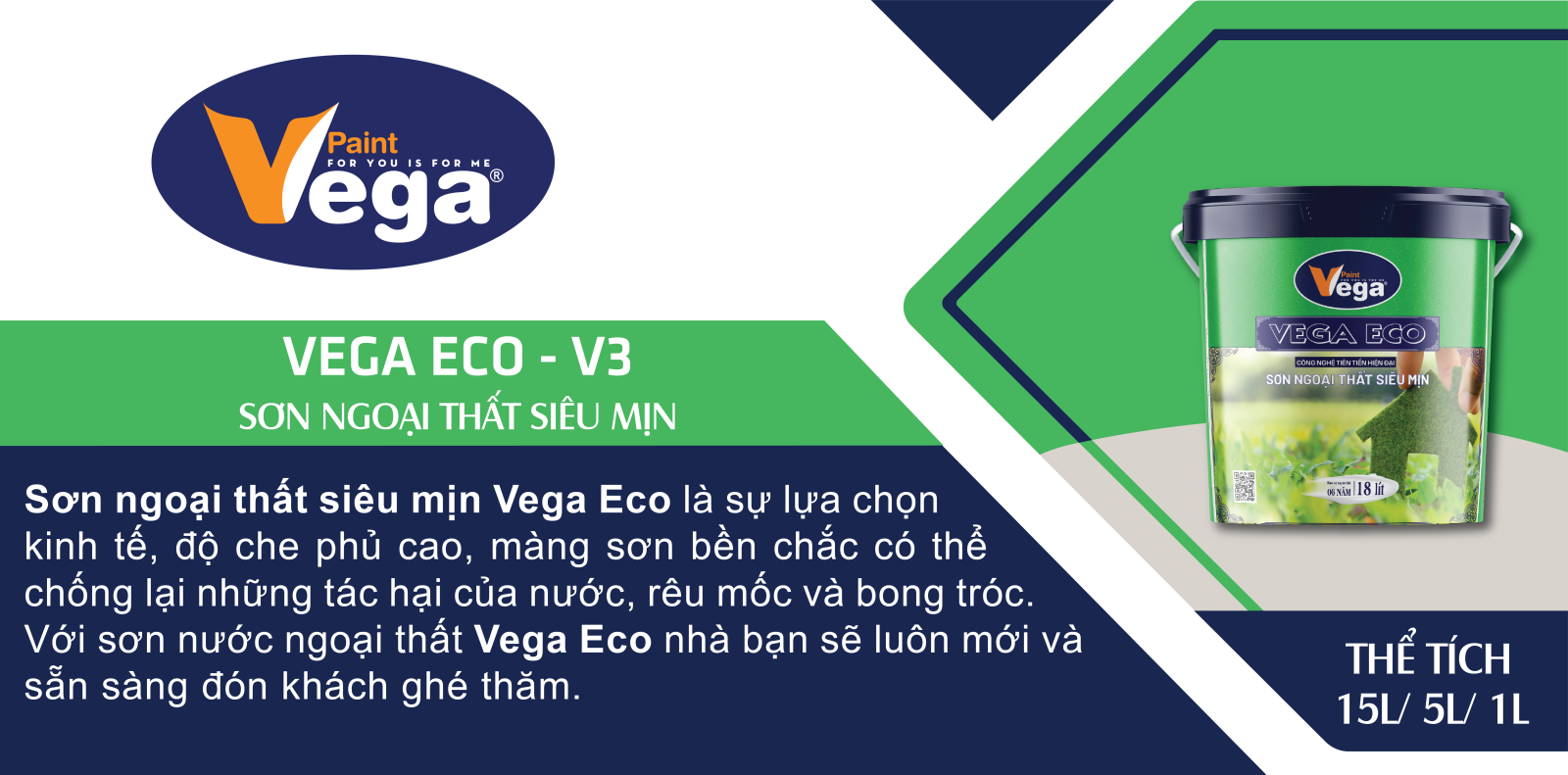 Sơn ngoại thất siêu miện Vega Eco là sự lựa chọn kinh tế, độ che phủ cao, màng sơn bền chắc có thể chống lại những tác hại của nước, rêu mốc và bong tróc. Với