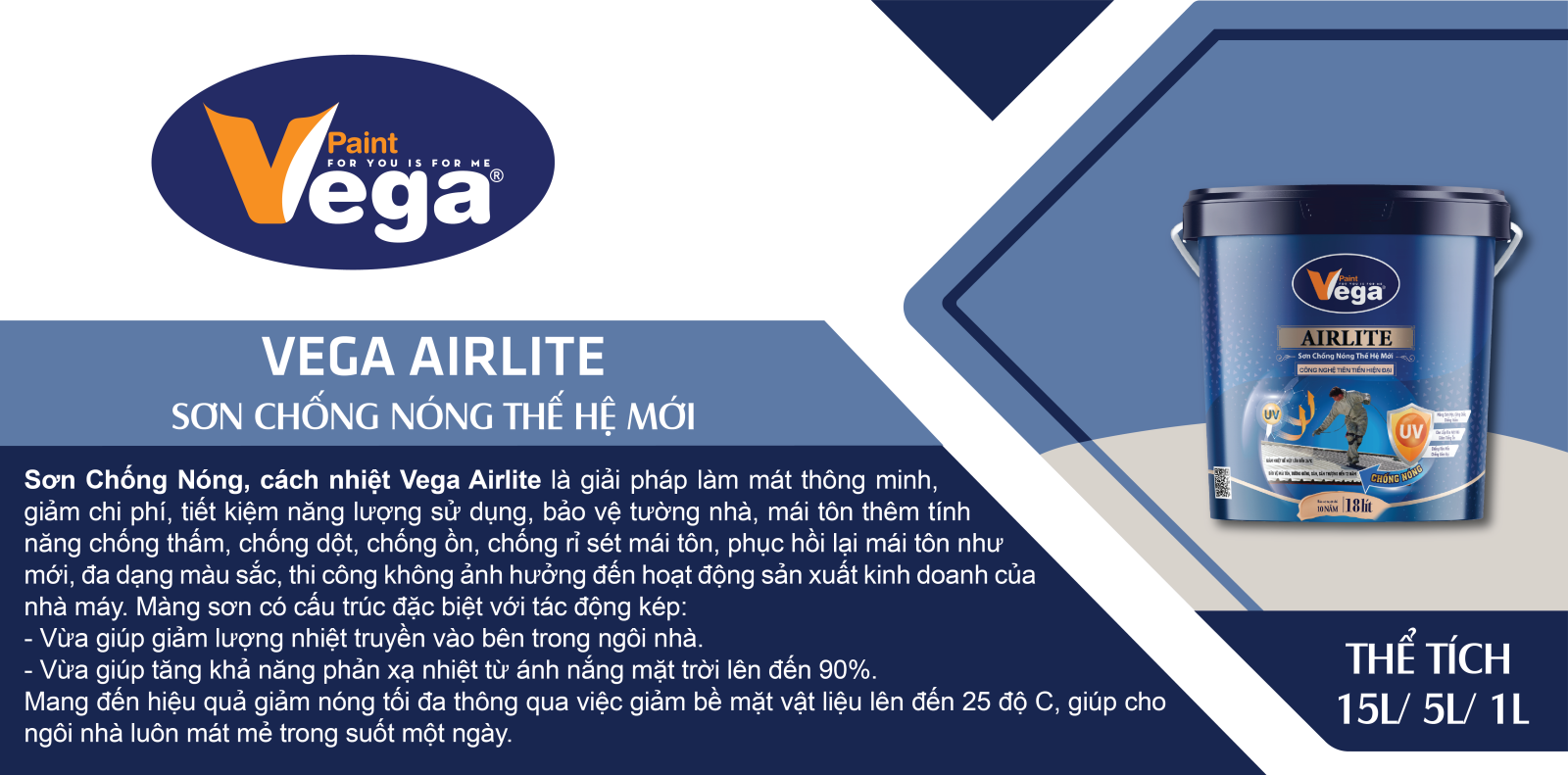 Sơn chống nóng thế hệ mới Vega Airlite là giải pháp làm mát thông minh, giảm chi phí, tiết kiệm năng lượng sử dụng, bảo vệ tường nhà, mái tôn thêm tính năng chống thấm, chống dột, chống ồn, chống rỉ sét mái tôn, phục hồi lại mái tôn như mới, đa dạng màu sắc.