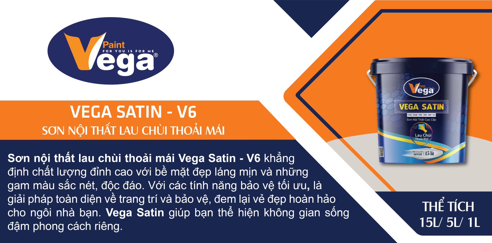 Sơn bóng nội thất cao cấp Vega Satin có chất lượng cao, bền màu, màu sắc tươi sáng, độ bóng cao, dùng cho mục đích trang trí và bảo vệ bề mặt tường trong nhà. Là loại sơn có độ phủ cao, bề mặt bóng, dễ lau chùi vết bẩn và dễ thi công. Sơn nội thất lâu chủi thoải mái Vega Satin khẳng định chất lượng cao với bề mặt đẹp láng mịn và những gam mài sắc nét, độc đáo, với các tính năng bảo vệ tối ưu, Vega Satin là giải pháp toàn diện về trang trí và bảo vệ, đem lại vẻ đẹp hoàn hảo cho ngôi nhà của bạn,
