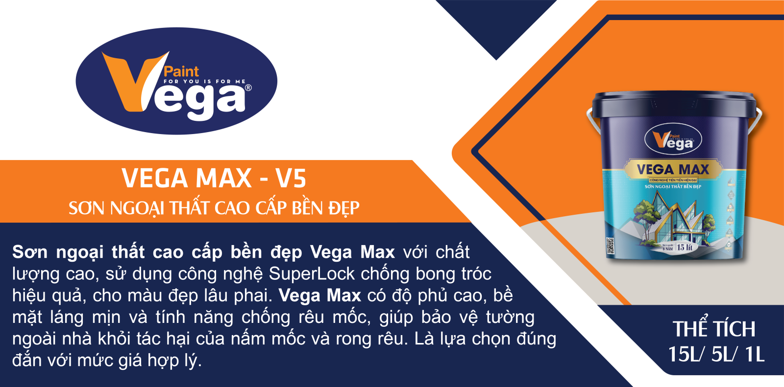 Sơn nước ngoại thất cao cấp Vega Max với chất lượng cao, sử dụng công nghệ SuperLock chống bong tróc hiệu quả, cho màu đẹp lâu phai. Vega Max còn có độ phủ cao, bề mặt láng mịn và tính năng chống rêu mốc, giúp bảo vệ tường ngoài nhà khỏi tác hại của nấm mốc và rong rêu là lựa chọn đúng đắn với mức giá hợp lý.