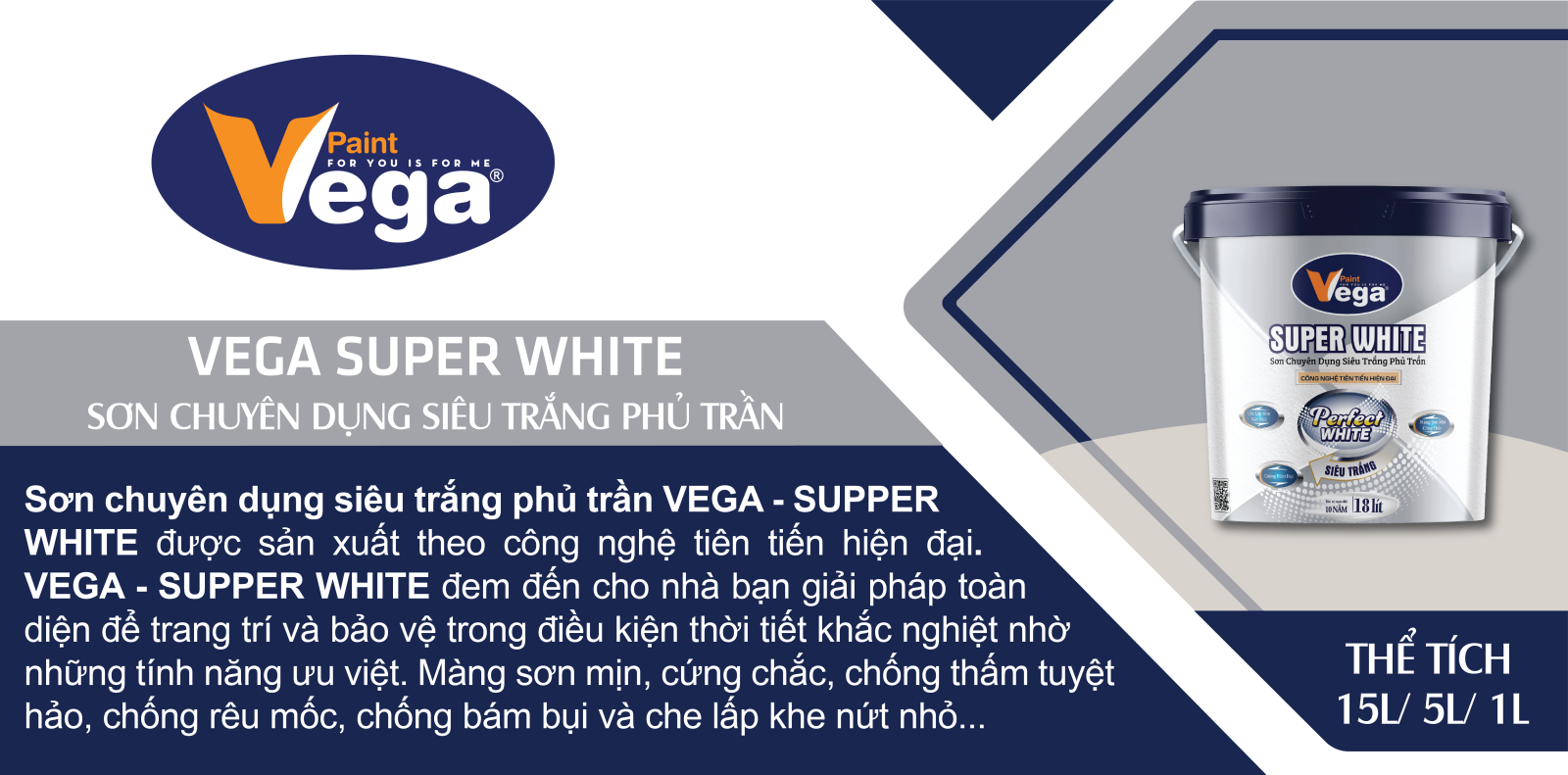 Sơn nội thất cao cấp Vega Super White chuyên cho phủ trắng trần. Đây là loại sơn hệ Acrylic chất lượng cao, đã hoàn toàn nhiệt đới hóa, phù hợp với khí hậu nóng ẩm của Việt Nam, đặc biệt phù hợp cho các công trình kiến trúc cao cấp, sang trọng, lộng lẫy.